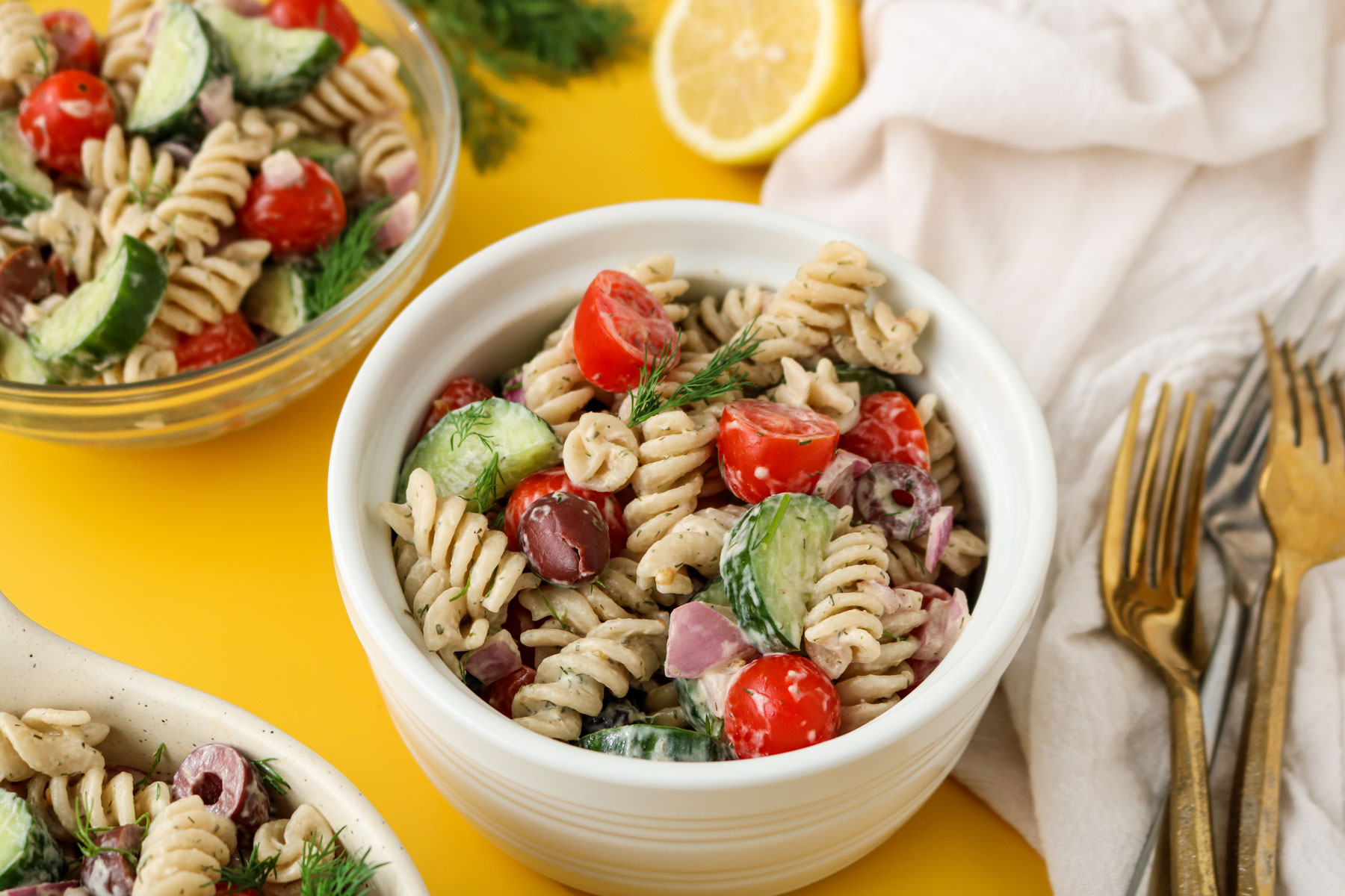- Add a squeeze of lemon juice to the vegan greek pasta salad and sprinkle in the fresh dill. Toss to combine.